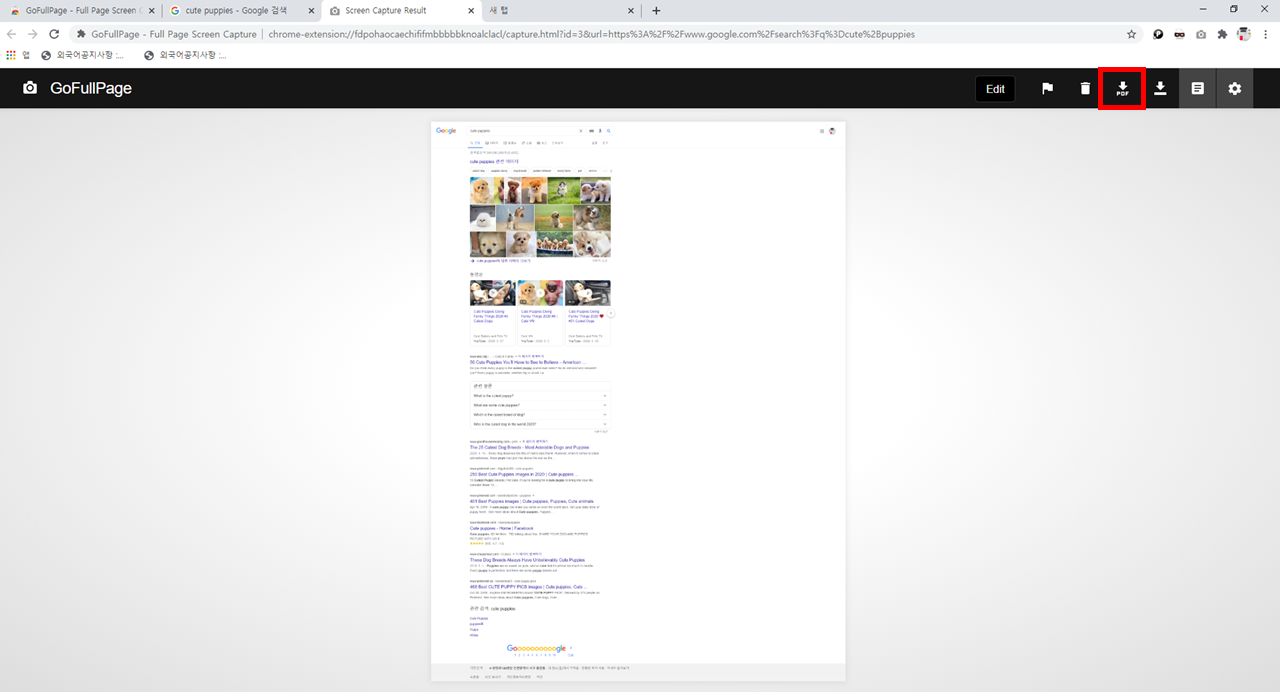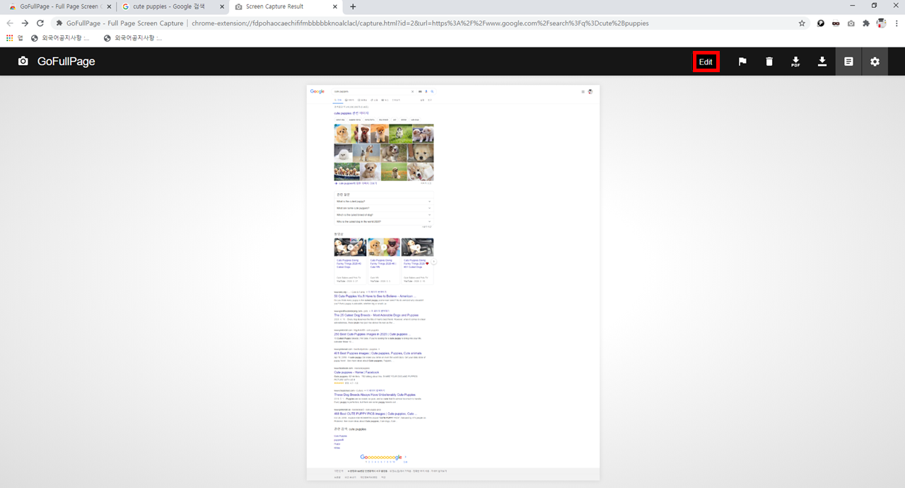 다음과 같이 웹페이지가 캡쳐가 완료되었습니다. 이제 웹페이지의 필요 없는 부분을 잘라 보겠습니다. 메뉴의 Edit 버튼을 클릭 합니다.