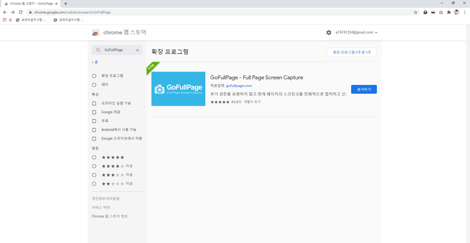 크룸 브라우저에서 스크롤 캡쳐 후 PDF로 바로 저장 하는 방법을 소개 할까 합니다. 먼저 확장 프로그램을 다운로드 받아야 합니다. 하단의 링크를 이동 하시거나 크롬 웹스토어에서 GoFullPage를 검색하고 설치를 합니다.