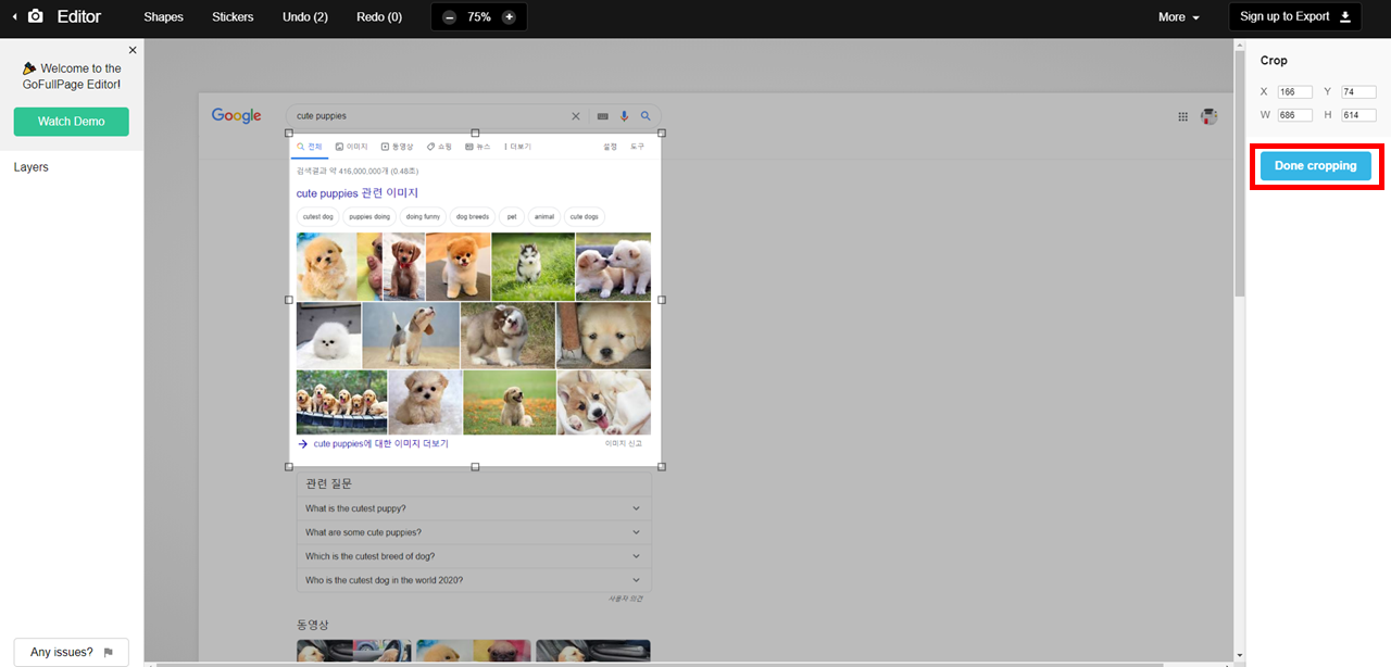 영역을 지정하셨다면 왼쪽 버튼의 Done Cropping 편집의 완료 됩니다.