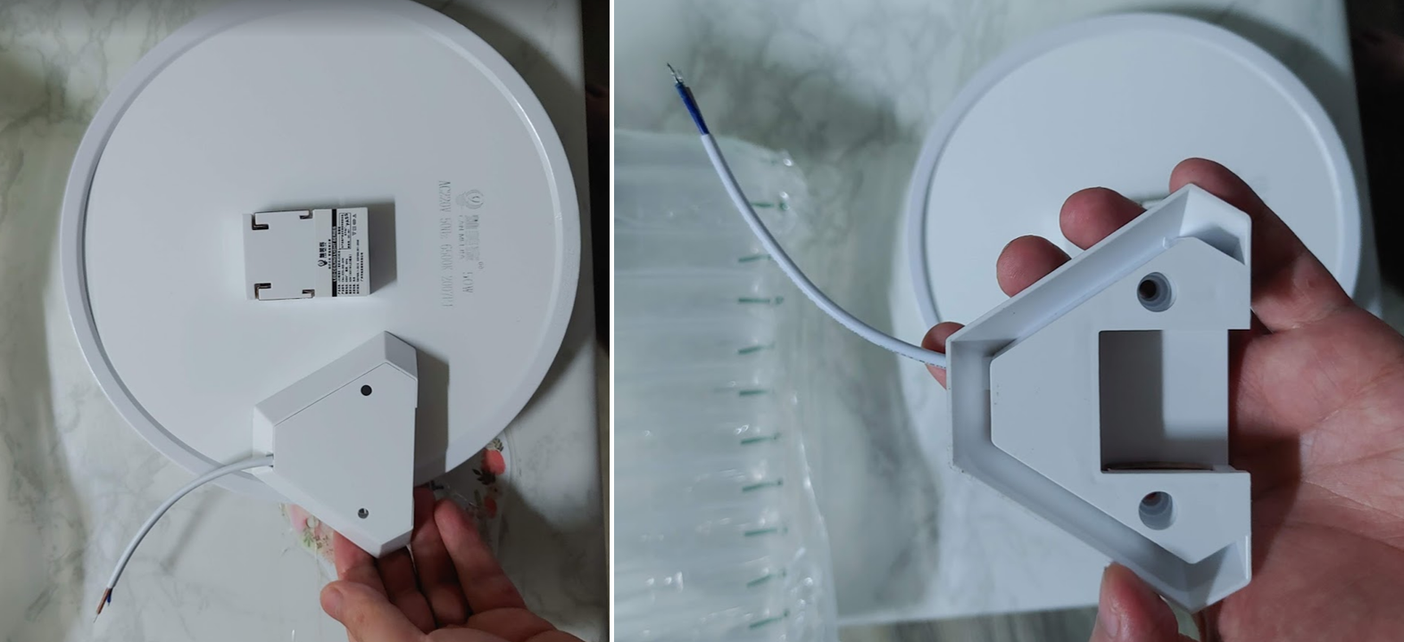 세모난 모양의 플라스틱 모양이 거치대 입니다. 이 거치대를 위로 올리면 거치대와 전등이 분리가 됩니다. 거치대의 양쪽 끝에 나있는 구멍으로 나서를 이용 천장에 고정하고, 전등을 고정하는 방식으로 되어 있습니다.