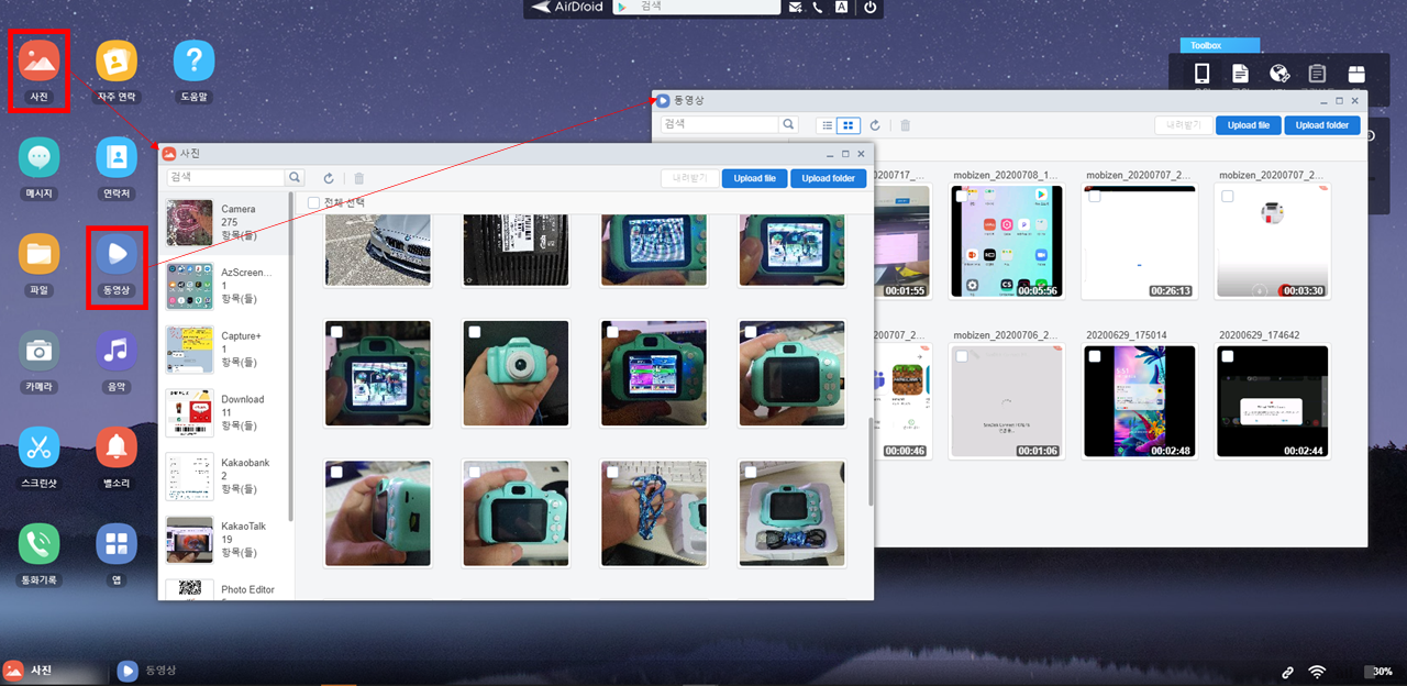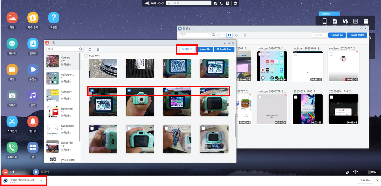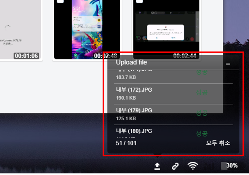 6. 하단의 스마트폰으로 사진, 동영상 파일이 업로드되고 있는 것을 확인할 수 있습니다.