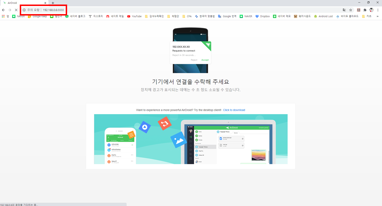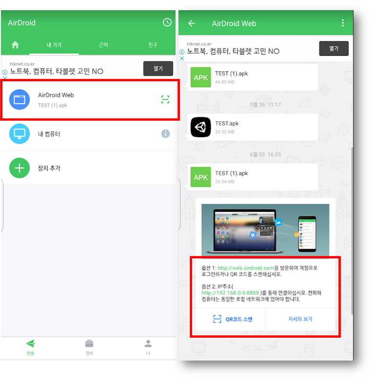 내부망인 경우 AirDroid를 실행하고 내기기 -> AirDroid Web 앱을 클릭합니다.