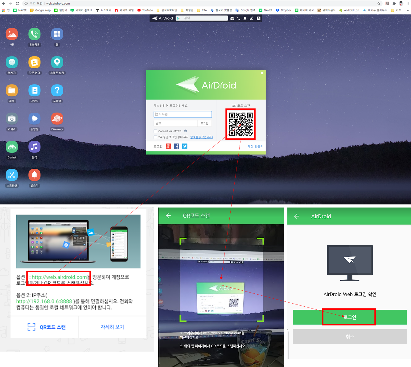 먼저 컴퓨터와 안드로이드 기기를 동일한 망(같은 WIFI 또는 내부망을 의미)으로 접속을 합니다. 내부망을 접속할 수 없는 경우에는 웹 주소 (http://web.airdroid.com/)로 접속하여 QR 코드 로그인을 시도하시는게 편합니다. 자신이 접속하기 쉬운 방향으로 로그인을 합니다.