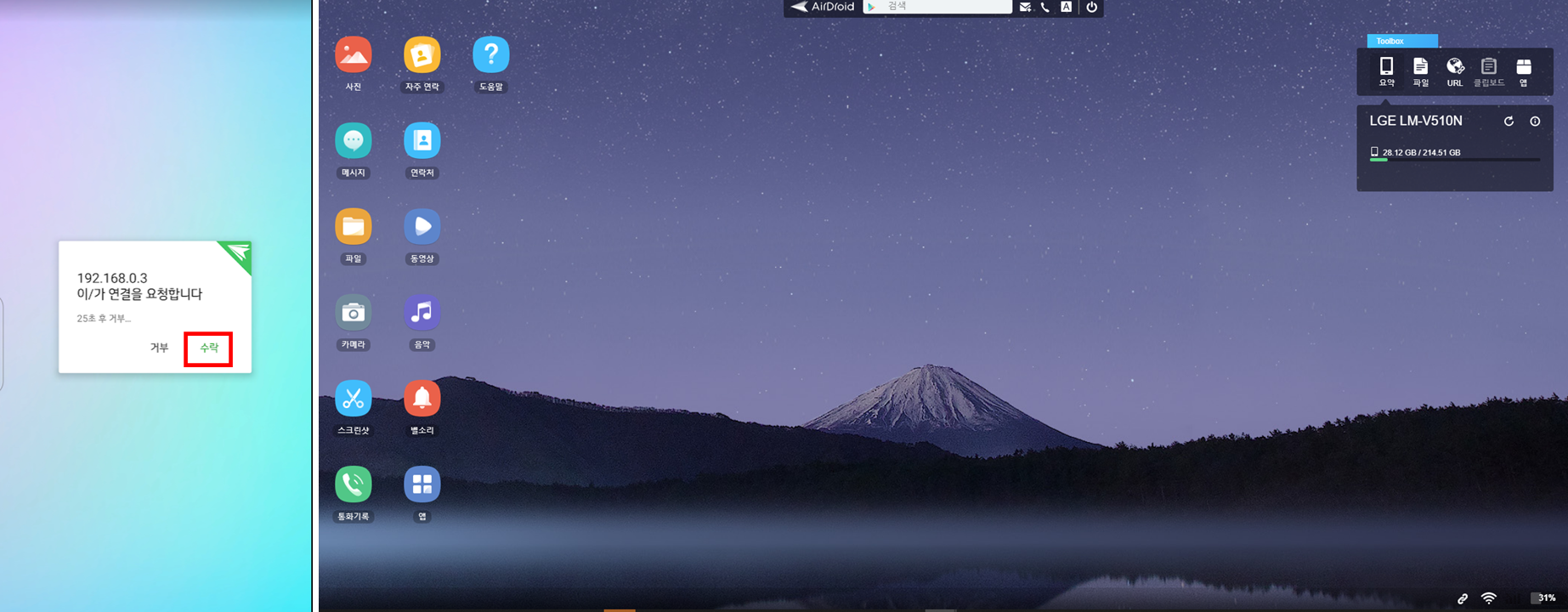2. 스마트폰에서 기기 연결 요청 메시지가 출력되고 수락 버튼을 선택하면 컴퓨터에서 휴대폰으로 접속할 수 있습니다.