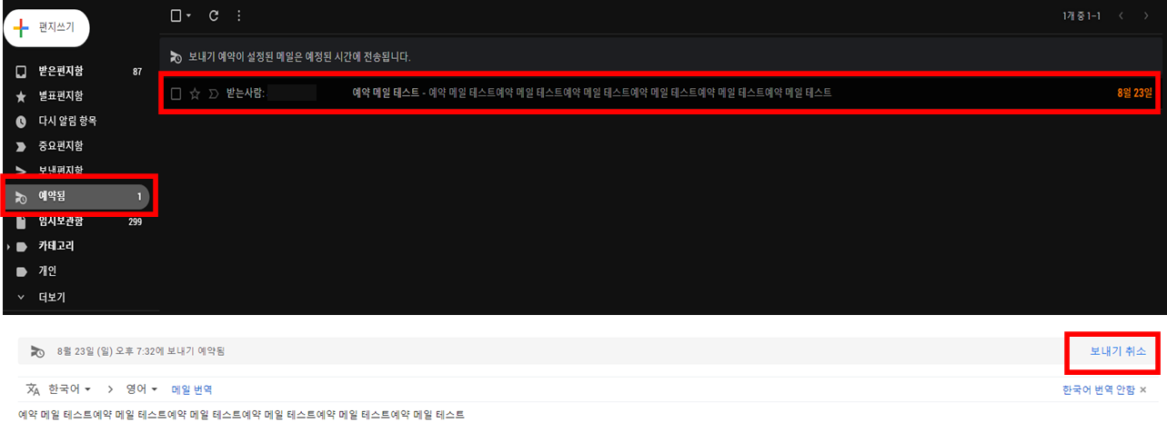 예약 메일을 보냈다면 예약이 잘되었는지 확인해봐야겠지요? Gmail 메뉴의 "예약됨"을 클릭하면 자신의 보낸 예약 메일의 리스트가 출력됩니다. 만약 예약 메일을 취소하고 싶다면 리스트로 들어가 "보내기 취소" 버튼을 클릭하면 예약 메일이 취소가 됩니다.
