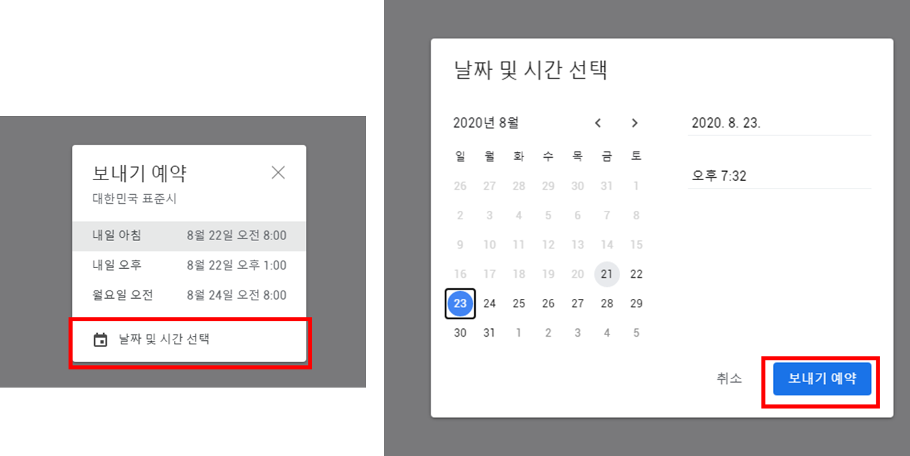 보내기 예약시 내일 아침, 내일 오후, 월요일 오전, 등 메일을 보내기 좋은 시간을 추천해주고, 만약 자신이 원하는 날짜 및 시간이 있다면 "날짜 및 시간 선택"으로 자신이 원하는 날짜와 시간에 메일을 보낼 수 있습니다.