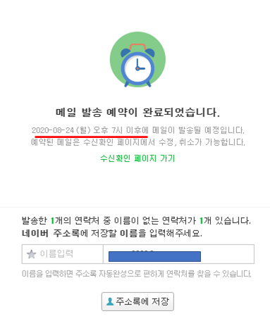 4. 메일 발송 예약이 완료되었다는 메시지와 함께, 자신이 예약한 시간 이후에 메일이 발송될 예정이라고 친절하게 설명을 해줍니다.