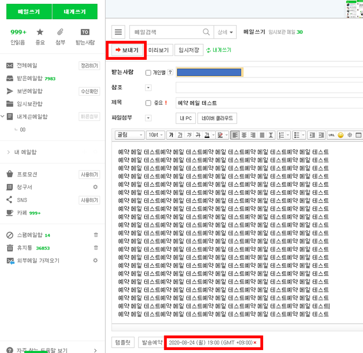 3. 발송 예약 옆 자신이 예약한 날짜와 시간이 추가가 됩니다. 보내기 버튼을 클릭 합니다.