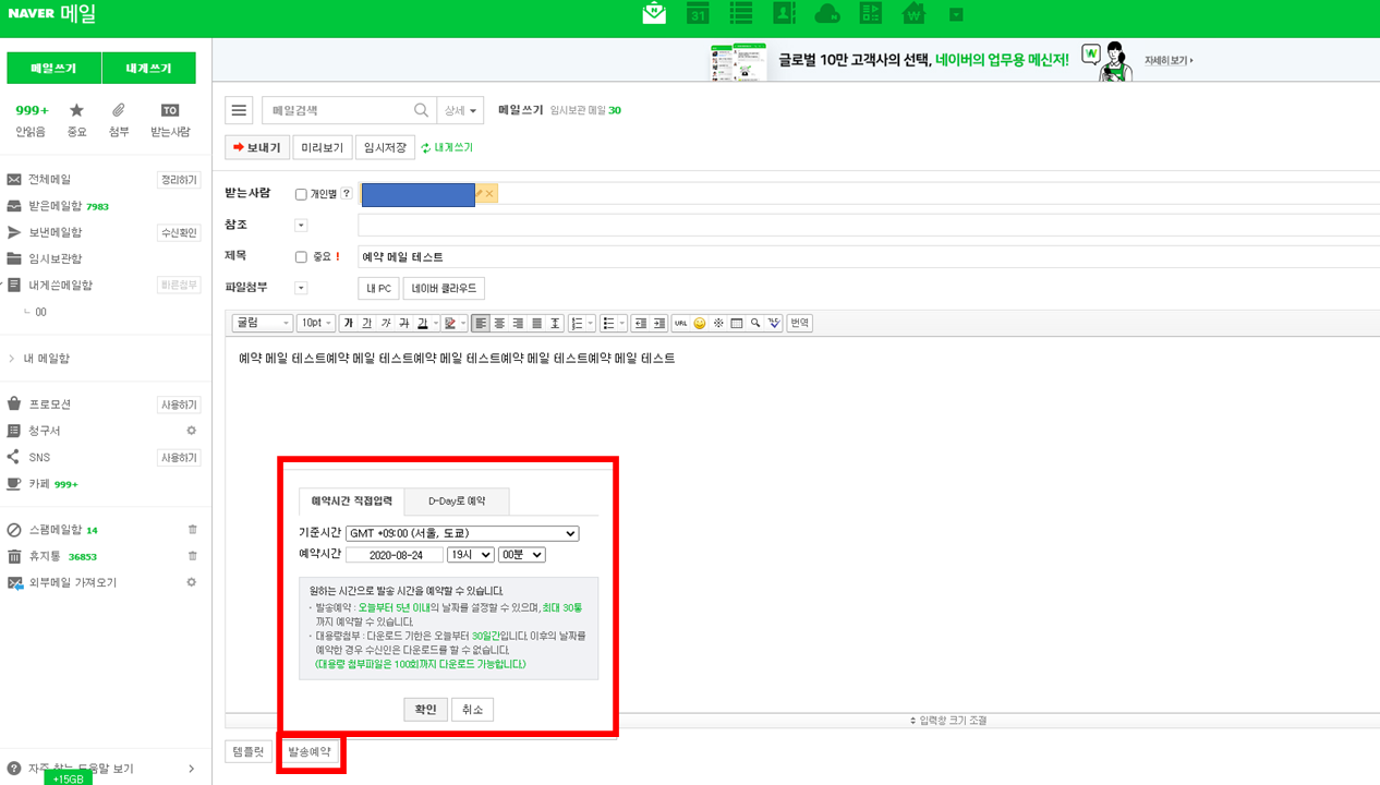 2. 하단 발송 예약 버튼을 클릭 후 자신의 원하는 날짜와 시간을 선택하고 확인 버튼을 클릭 합니다.
