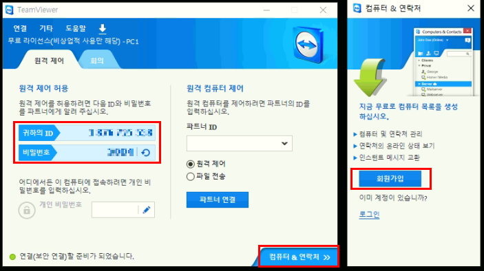 설치가 완료되면 팀뷰어가 자동으로 실행됩니다. 귀하의 ID와 비밀번호가 생성된 것을 확인할 수 있습니다. 이 아이디와 비밀번호로 인증 후 스마트 폰으로 PC를 원격제어를 수 행 할 수 있습니다.