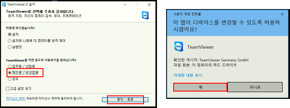 이제 TeamViewer_Setup_8.0.exe 파일을 PC에 설치를 합니다. 설치 파일을 실행하면 사용 용도를 물어보는 메시지가 출력됩니다. 개인용 / 비상업용을 선택합니다. 업무용으로 회사에서 사용하실 분들은 라이선스를 구입하셔야 합니다. 그 후 관리자 권한을 요청하는 메시지가 출력되고, "예" 버튼을 클릭하면 자동으로 설치가 진행됩니다.