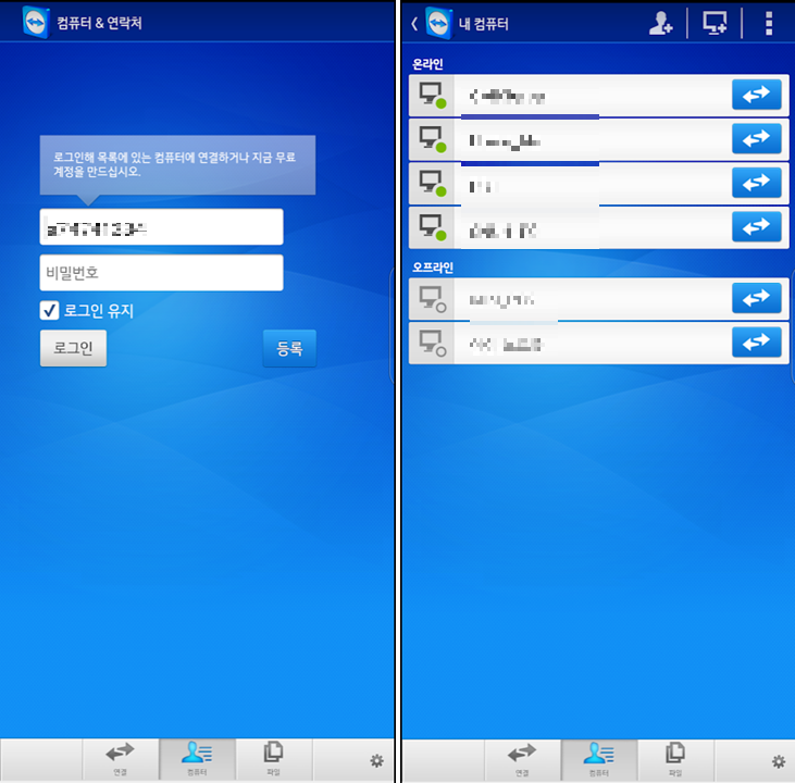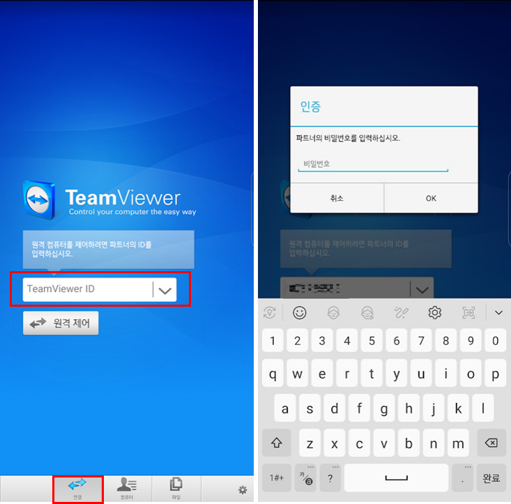 이제 스마트폰에 설치한 팀뷰어를 설치합니다. 하단의 연결 버튼을 선택하면 TeamViewer ID에 위 귀하의 ID를 입력합니다. 그러면 바로 패스워드를 입력하라는 창이 출력되고 패스워드를 입력하면 원격 접속 연결이 됩니다.