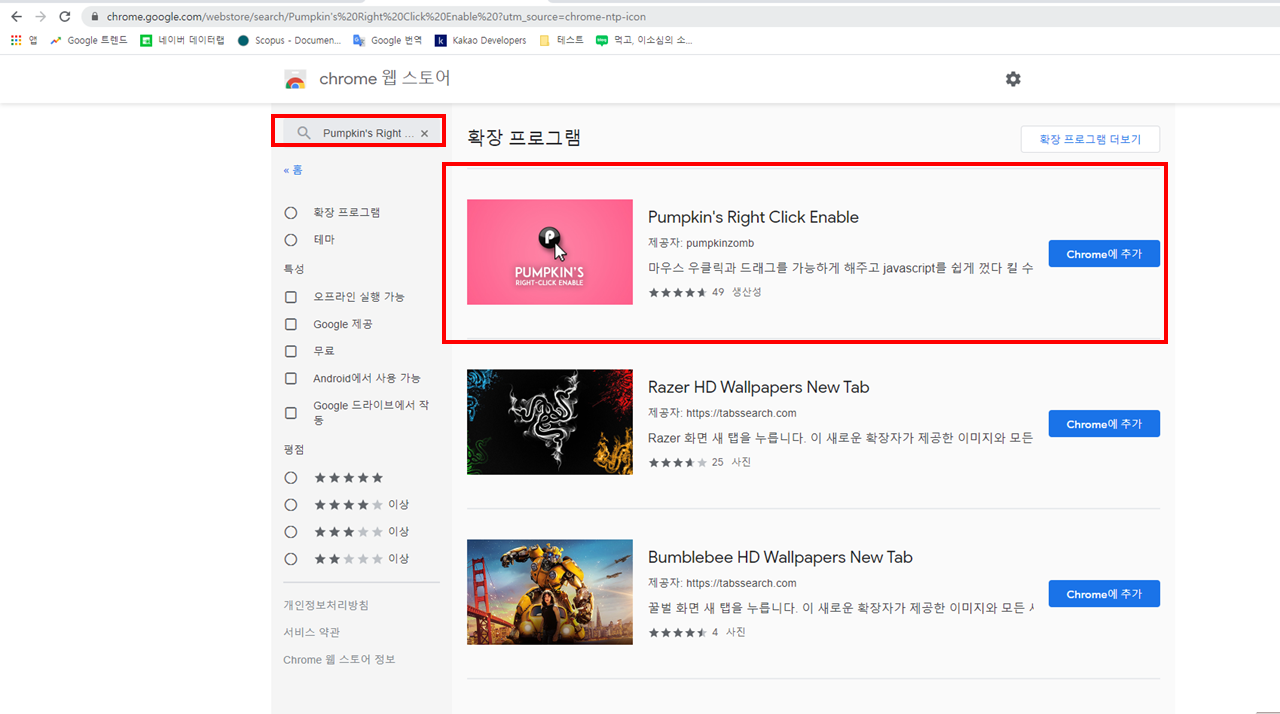 크롬 웹 스토어에서 왼쪽 상단 검색창에서 Pumpkin's Right Click Enable를 입력하고 검색 합니다. Chrome에 추가 버튼을 클릭하면 설치가 진행이 됩니다.