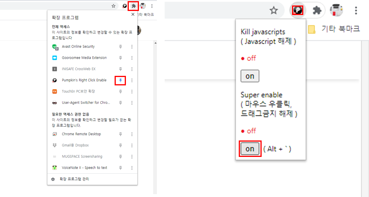 Kill javascripts 해제의 경우 해제가 되었지만 이미지가 정상적으로 출력되지 않아서 Super enable (마우스 우클릭 드래그금지 해제)를 사용 했습니다.