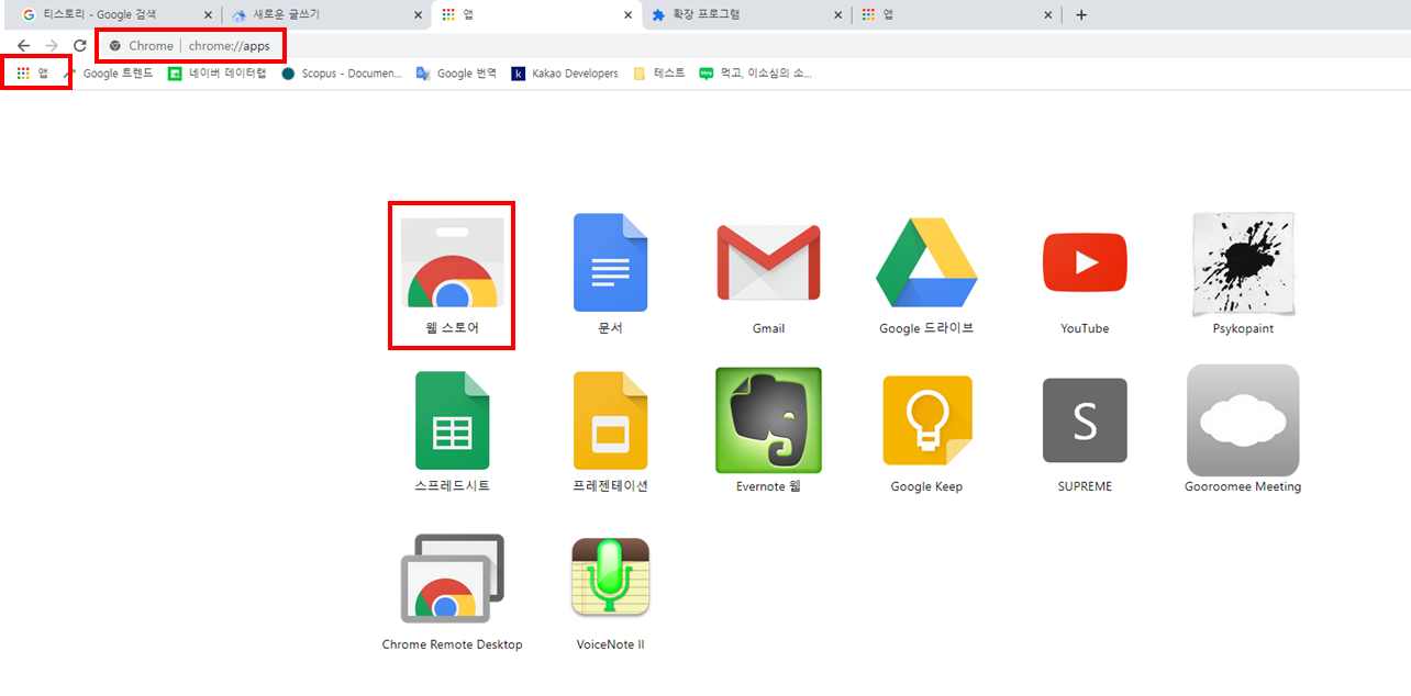 먼저 저희가 사용할 프로그램은 Pumpkin's Right Click Enable 입니다. chrome://apps/ 으로 접속하거나 북마크에 앱 아이콘을 클릭하시면 자신이 설치되어 있는 앱과 앱스토어 아이콘이 나타납니다. 또는 하단의 링크 버튼을 클릭해서 크롬 웹 스토어로 접속 합니다.