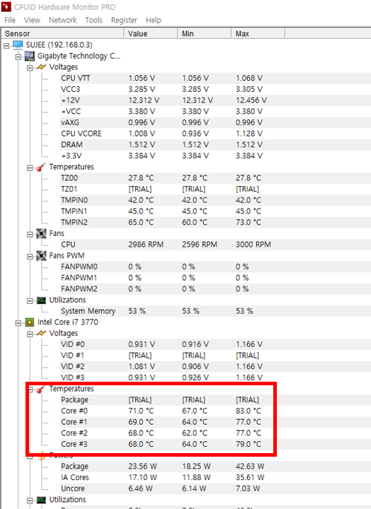 프로그램을 실행하면 아래같이 자신의 하드웨어 정보가 출력됩니다. 2번째 Intel Core i7 3770 CPU의 온도가 출력되는 것을 확인하실 수 있습니다.