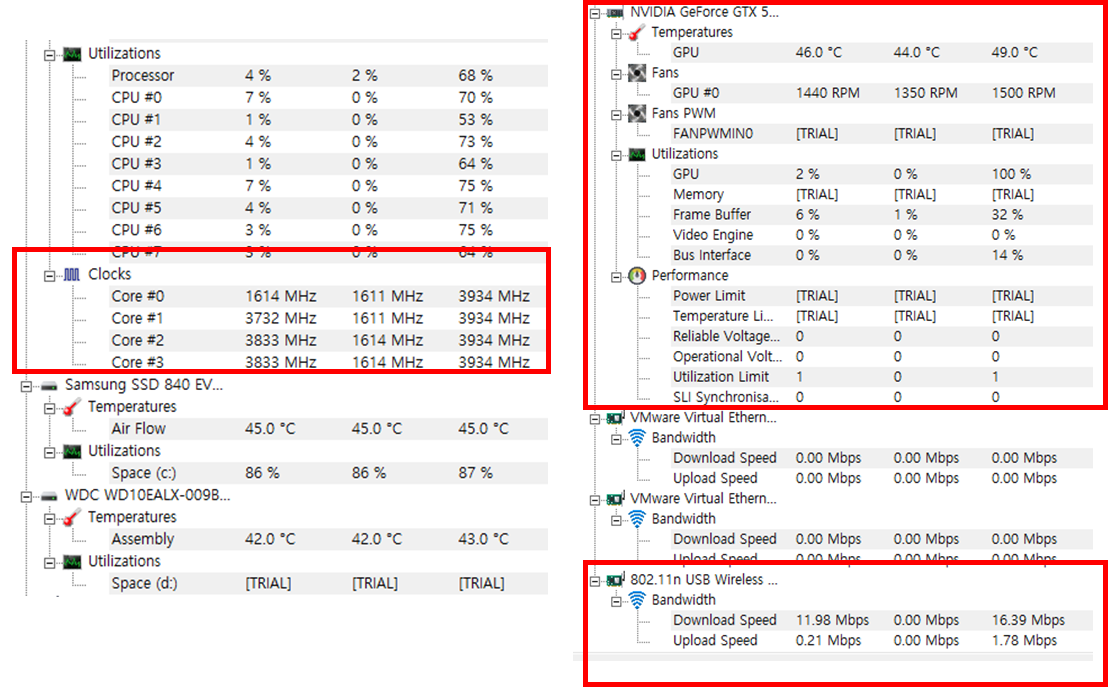 CPU 정보뿐만 아니라, 하드디스크, 그래픽카드, Wireless 사용량 등의 정보도 실시간으로 출력되는 것을 확인할 수 있습니다.