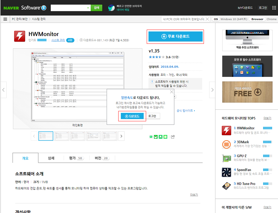 네이버 소프트웨어에서 무료로 다운로드 받을수 있고 용량도 크지 않기 때문에 가입하지 않고 빠르게 다운로드가 가능합니다. 무료 다운로드와 일반 속도로 다운로드를 선택합니다.
