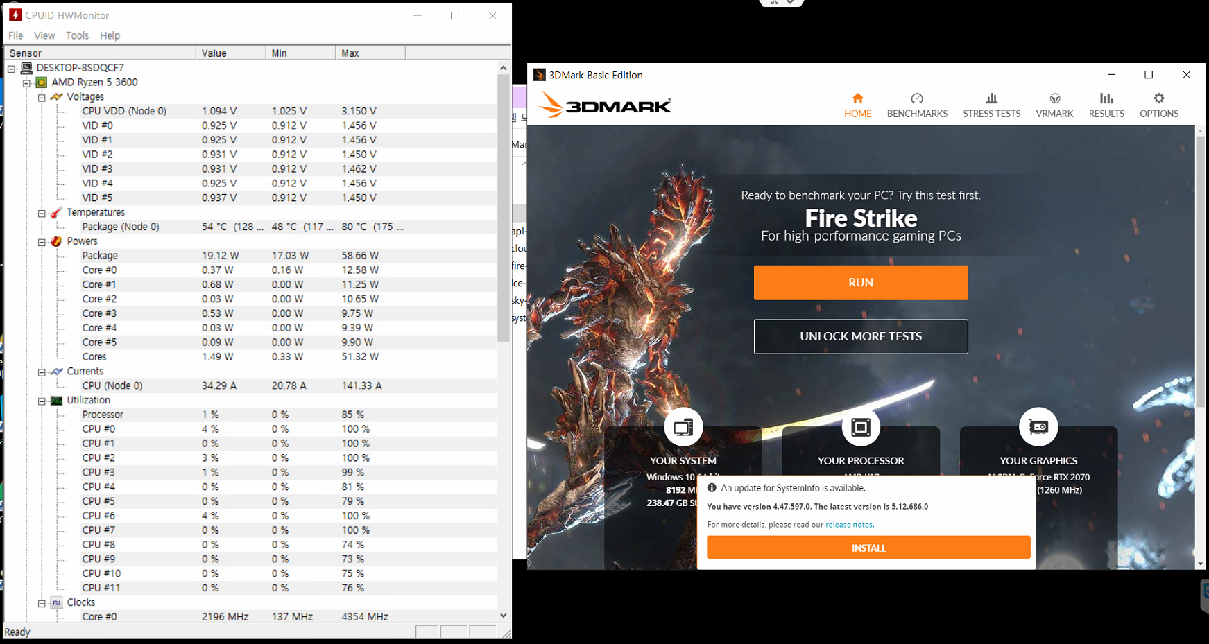 이제 3DMark와 HWMonitor를 각각 실행 합니다.