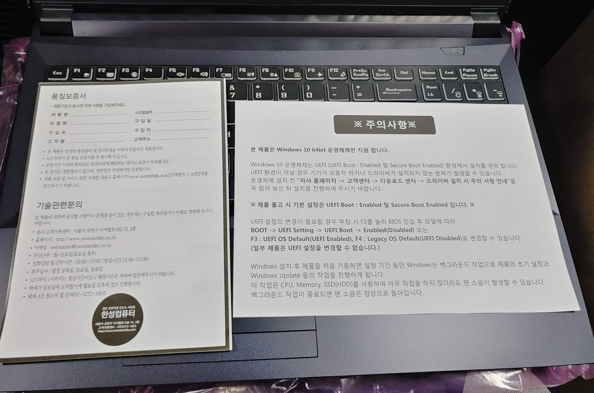 노트북을 열어보면 품질 보증서와 들어 있었습니다.