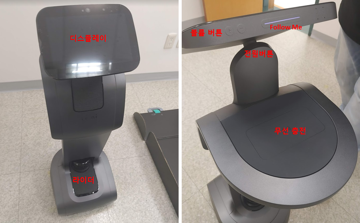 로봇 뒷면에는 무선 충전을 할수 있고, 중앙에 있는 LED에 손을 가볍게 터치하면 로봇이 따라가기 모드가 작동됩니다.