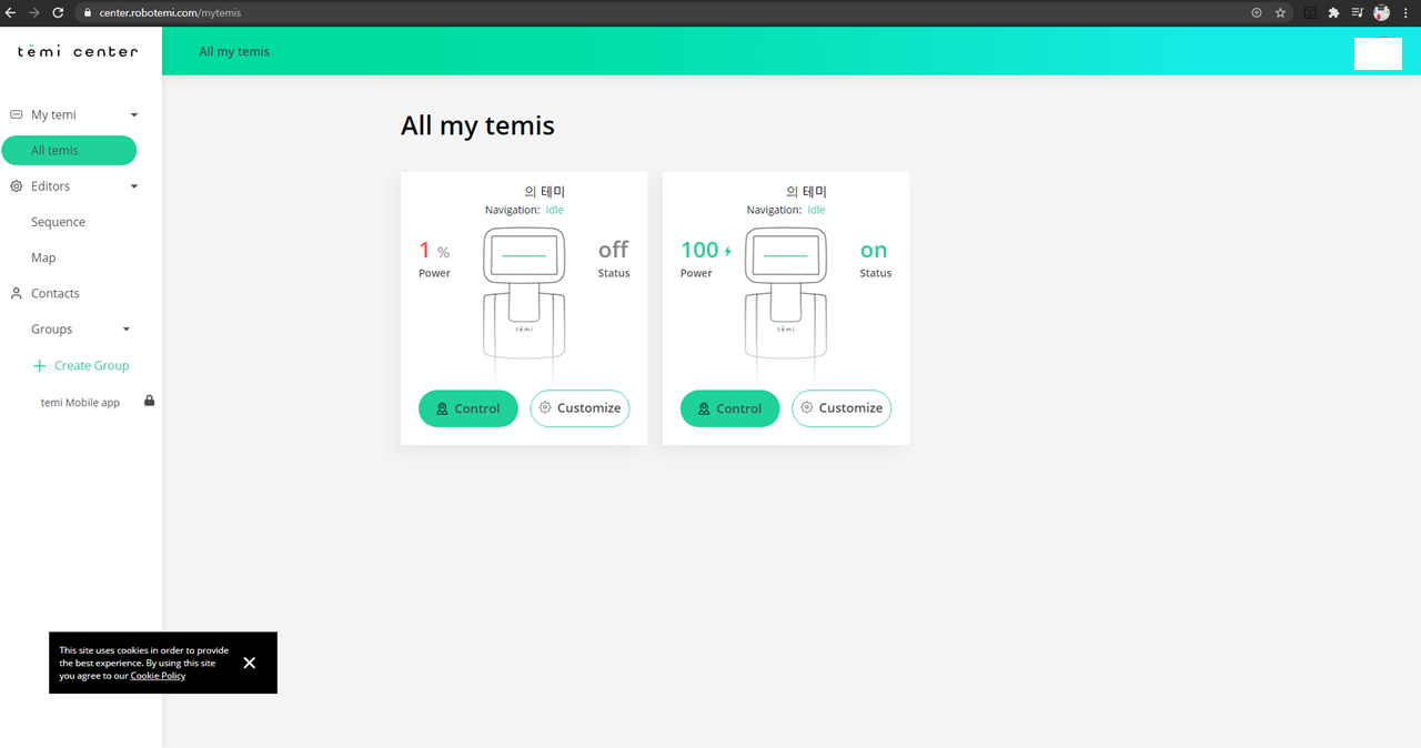웹 페이지에서 연결되어 있는 테미 로봇의 상태를 볼 수 있고, 컨트롤하고, 조정할 수 있습니다.