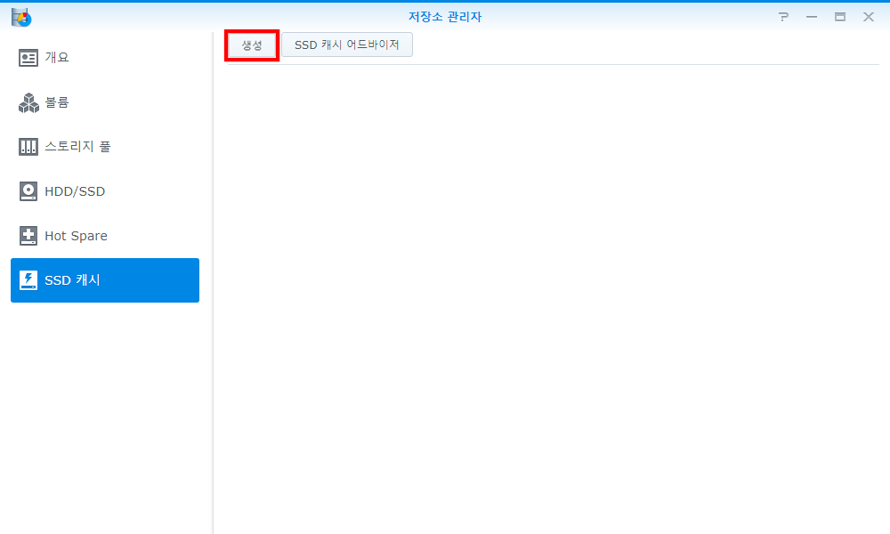 저장소 관리자 -> SSD 캐시 -> 생성 버튼을 클릭합니다.
