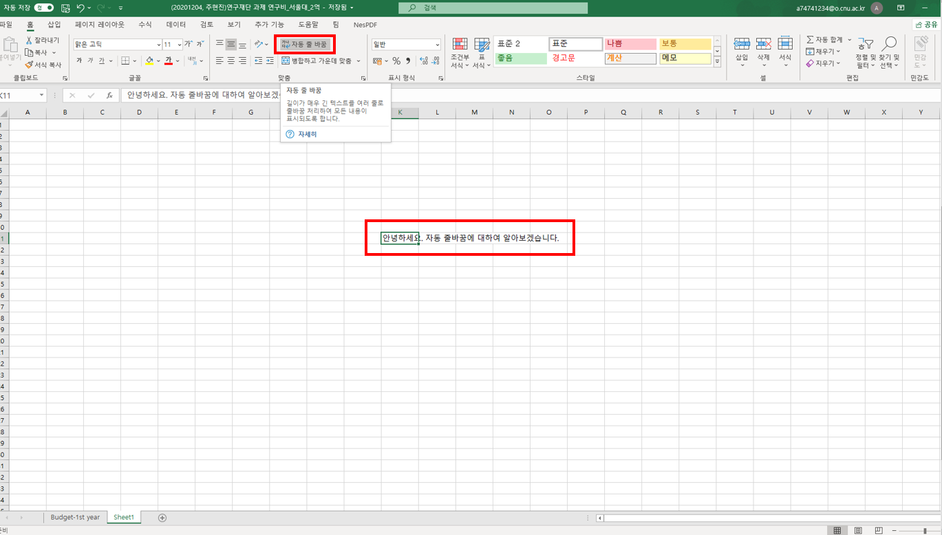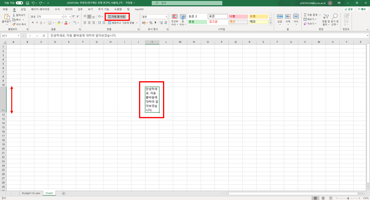 줄바꿈을 진행할 셀을 선택후 자동 줄바꿈 버튼을 클릭하면 아래와 같이 행의 길이가 변화되는 것을 볼수 있습니다.