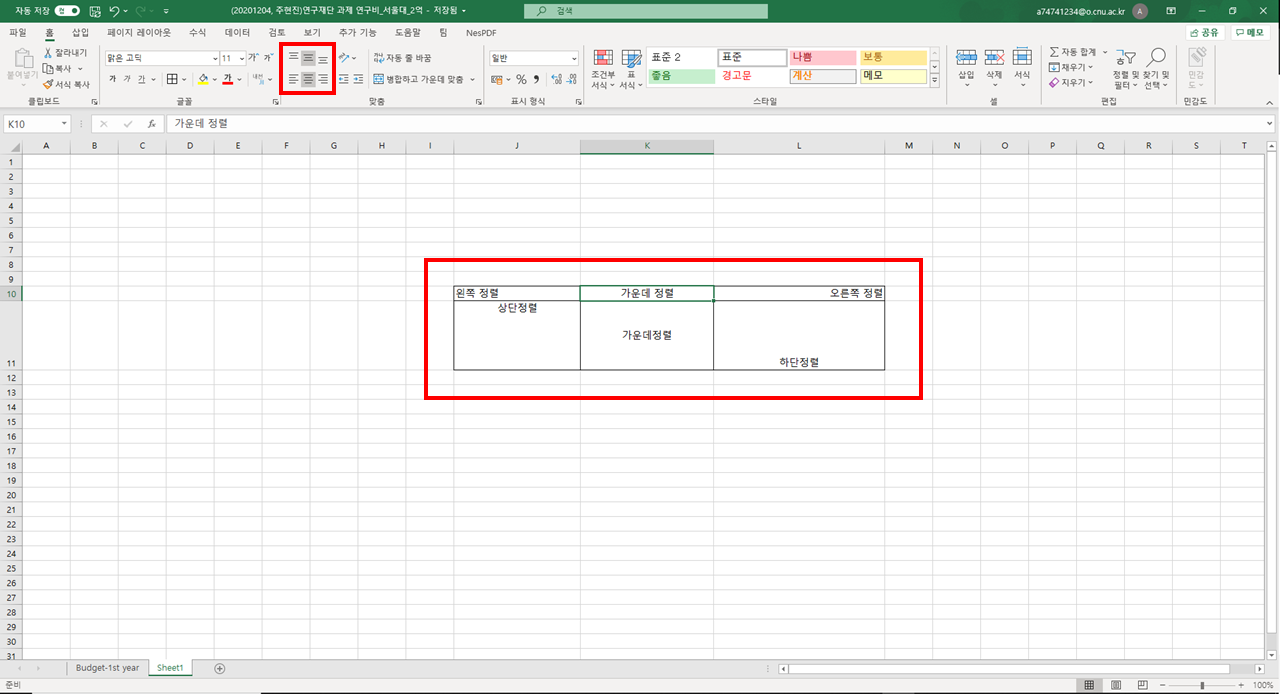 각 셀에 왼쪽 정렬, 가운데 정렬, 오른쪽 정렬을 입력해보았습니다.