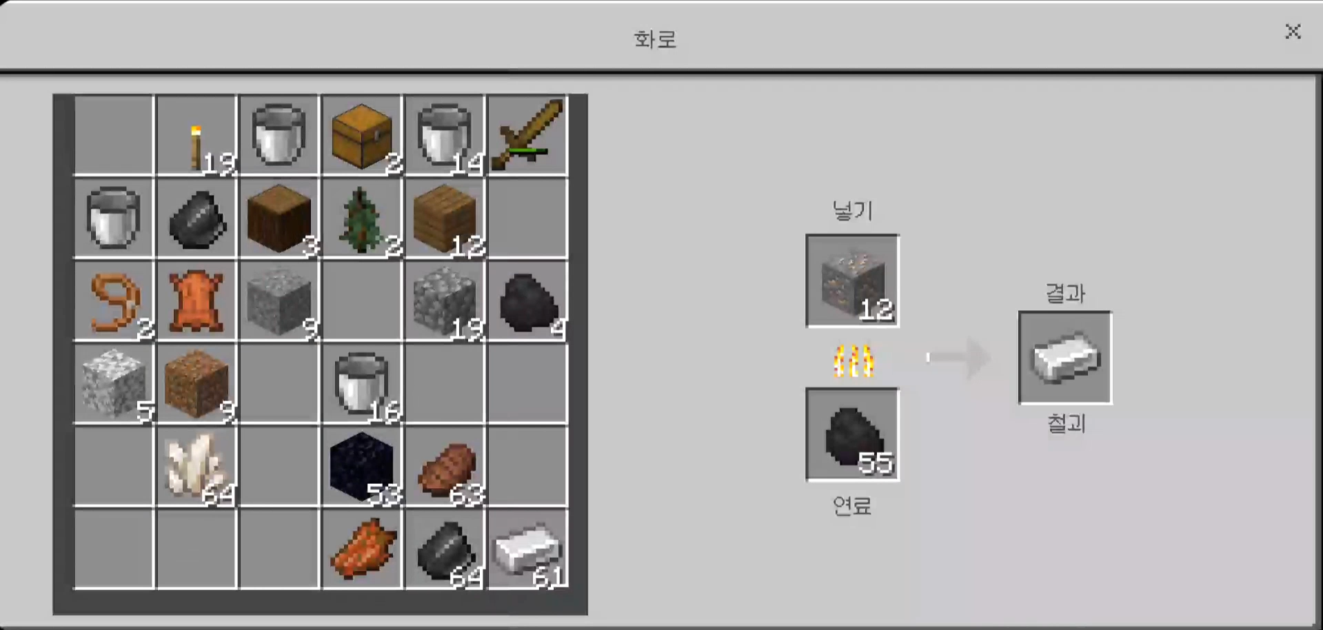 화로를 이용해서 재료에 철광석을 넣고 연료란에 석탄을 넣으면 철괴가 만들어지는 것을 확인할 수 있습니다.