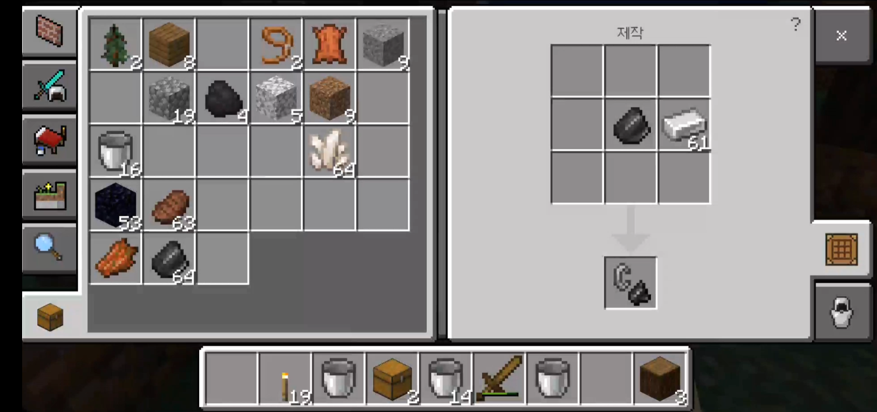 흑요석을 제작하기 위해서는 용암과 물이 필요하고 용암과 물을 담기 위해서 양동이도 필요합니다.