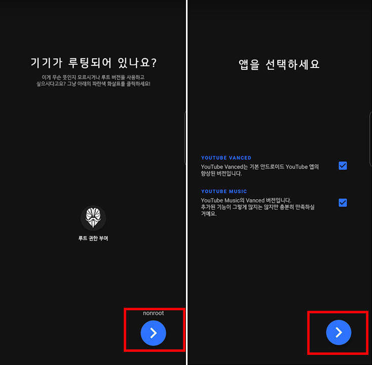 Vanced manager 앱 설치가 완료되면 순서에 따라 기기를 설정을 합니다.
