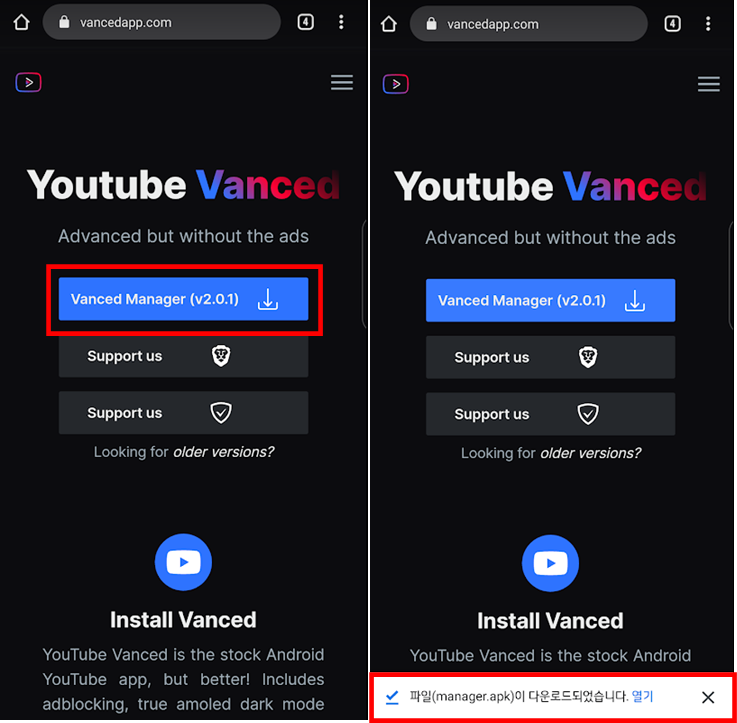 하단의 URL로 이동하여 vanced manager APK 파일을 다운로드하고 설치합니다.